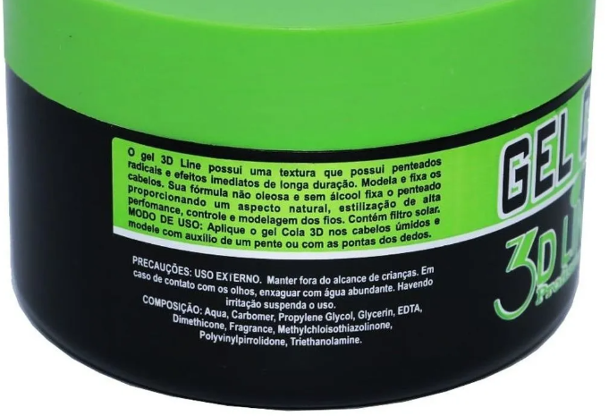 O GEL POSSUI UMA TEXTURA QUE PERMITE PENTEADOS RADICAIS E EFEITOS IMEDIATOS DE LONGA DURAÇÃO. MODELA E FIXA OS CABELOS, SUA FORMULA NÃO OLEOSA E SEM ÁLCOOL FIXA O PENTEADO PROPORCIONANDO UM ASPECTO NATURAL, ESTILIZAÇÃO DE ALTO DESEMPENHO- FRAGRÂNCIA SUAVE E AGRADÁVEL- CABELOS INCRIVELMENTE MODELADOS- CONTÉM FILTRO SOLAR- FIOS TRANSFORMADOS COM EFEITO, PROLONGADO.- INCOLOR- NÃO OLEOSO- SEM ÁLCOOL- TEXTURA PASTOSAMODO DE USAR.1 - APLIQUE O GEL COLA 3D LINE NOS CABELOS SECOS OU LEVEMENTE UMEDECIDOS.2 - MODELE COM O AUXILIO DE UM PENTE OU COM AS PONTAS DOS DEDOS.QUALIDADE COMPROVADA POR NOSSOS PRÓPRIOS CLIENTES